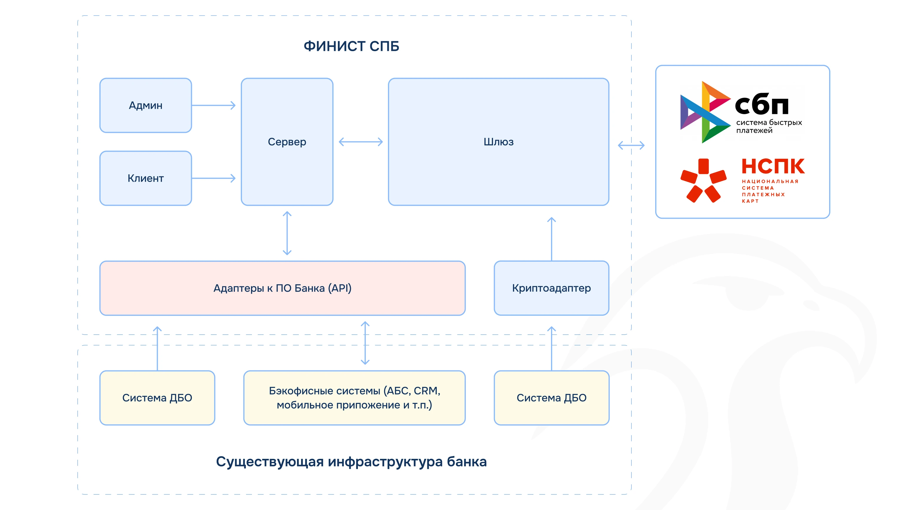 Система Finist-СБП реализован на базе микросервисной архитектуре, с возможностью динамического подключения сервисов. Каждый из сервисов может быть горизонтально масштабирован для увеличения пропускной способности, а общий набор сервисов может быть масштабирован как вертикально, так и горизонтально для обеспечения отказоустойчивости и равномерного распределения возрастающей нагрузки. Протокол обмена между сервисами – gRPC.